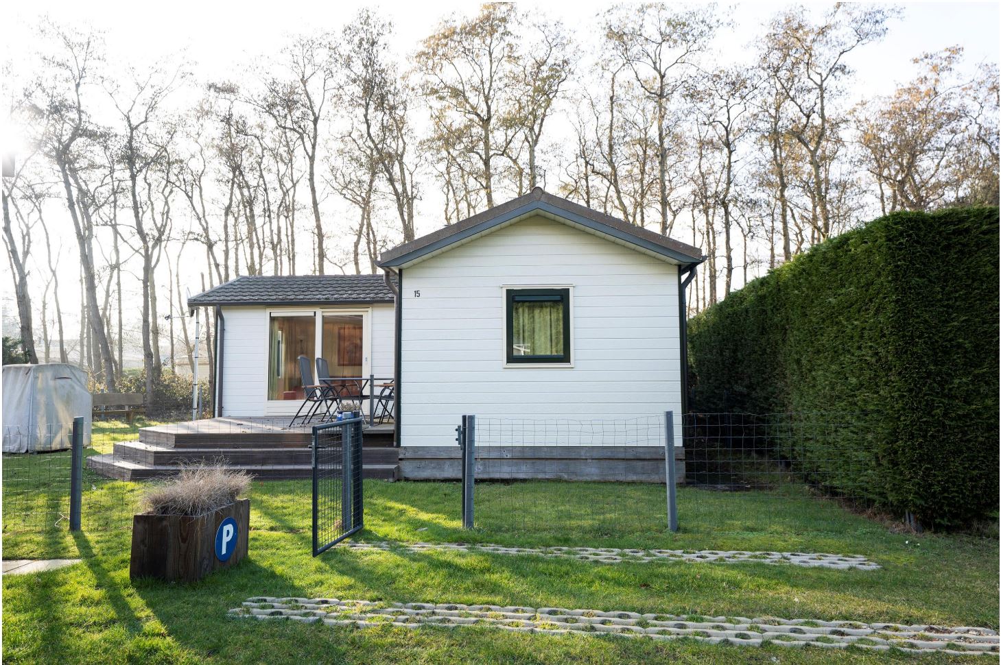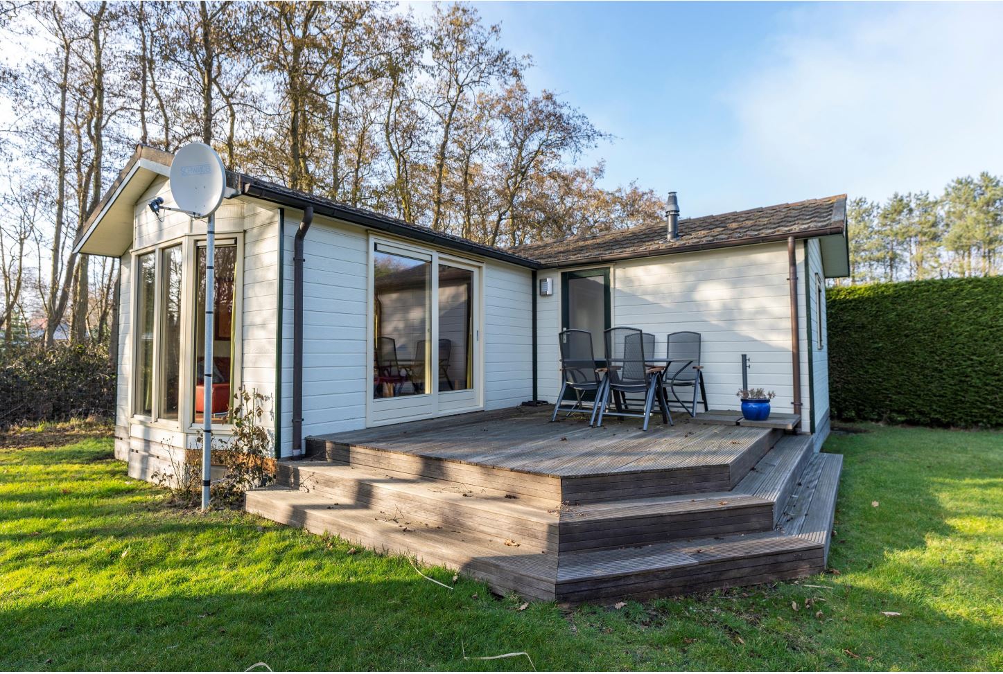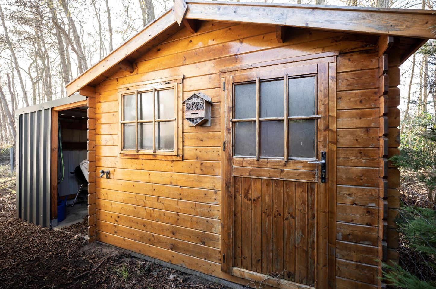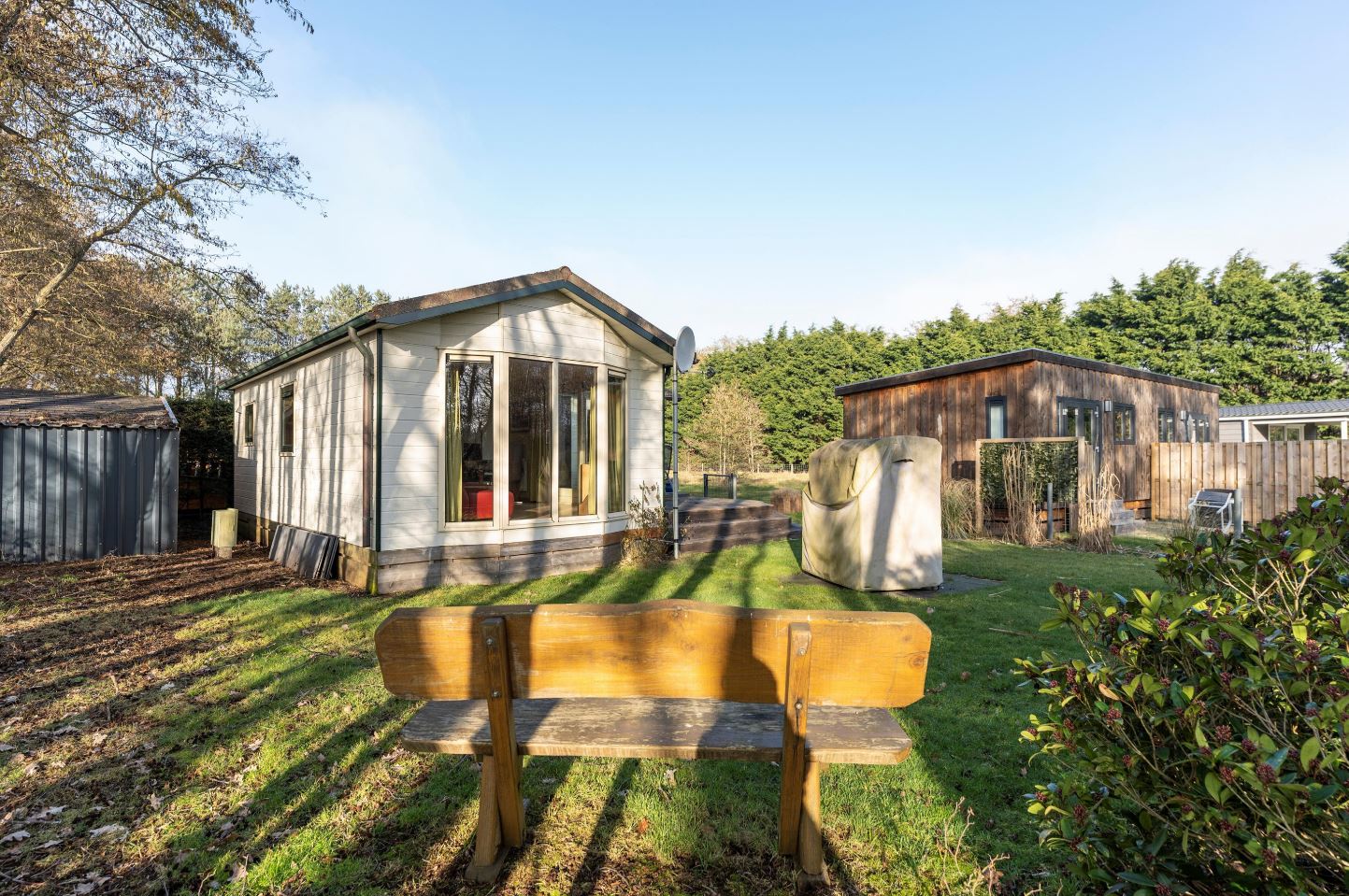Ruime tuin rondom het chalet met veel zonplekken. Naast het chalet is een extra opbergschuur incl. wasmachine, BBQ en 2 fietsen (vrij te gebruiken).