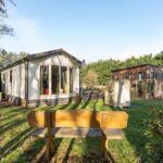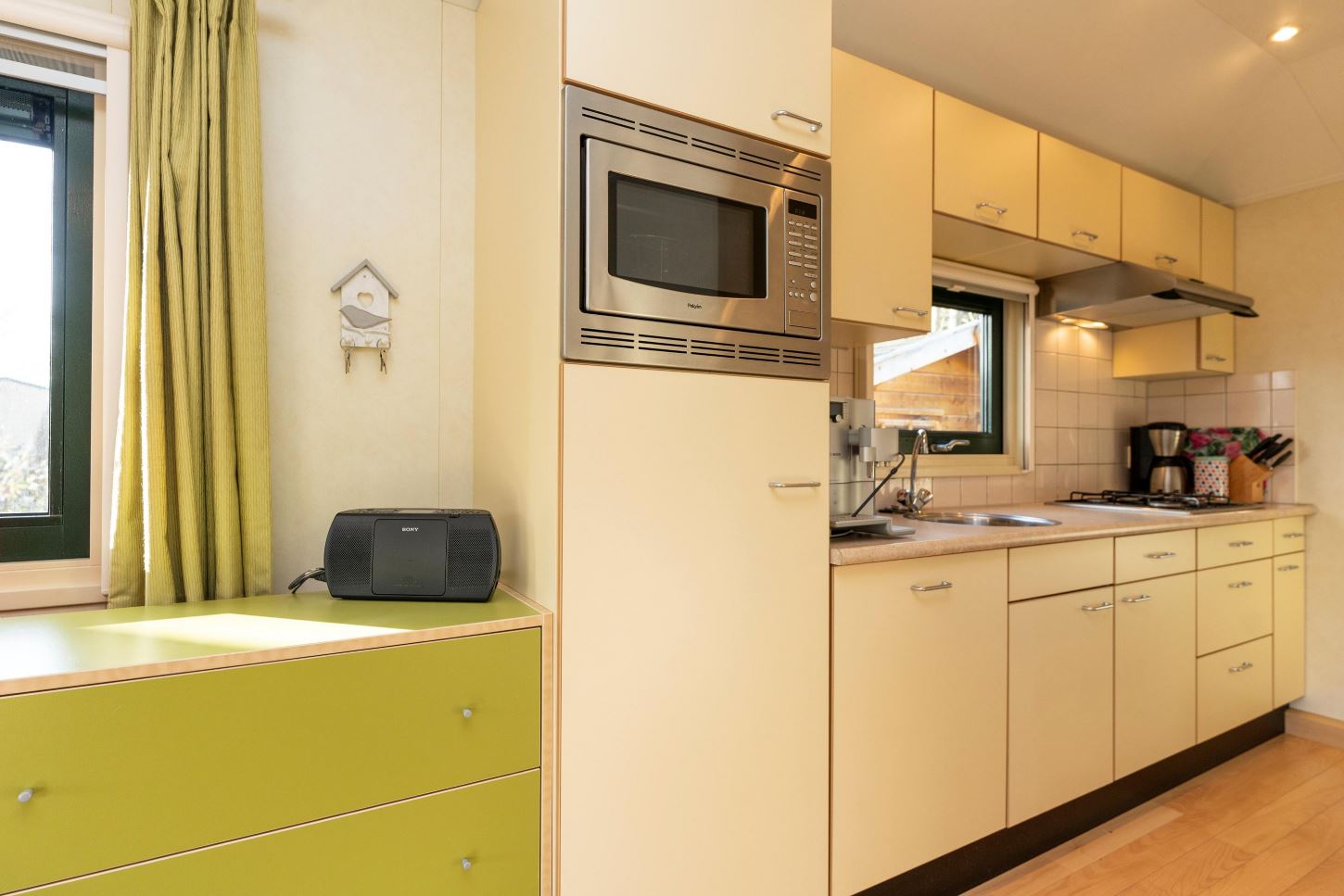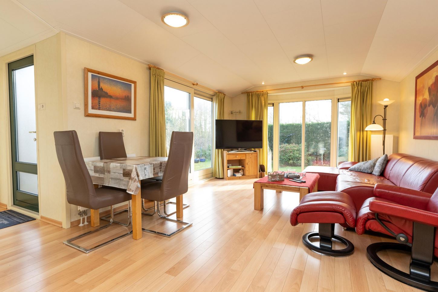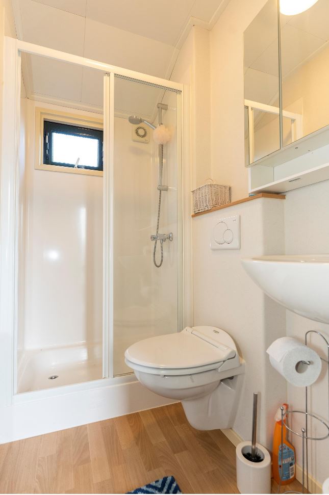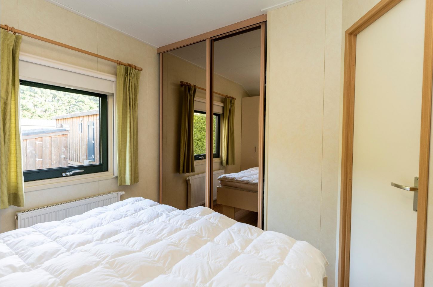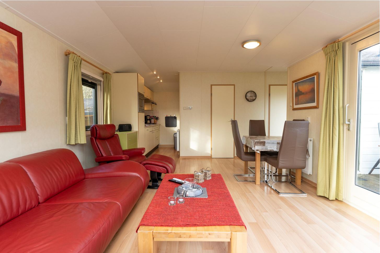 Ruime tuin rondom het chalet met veel zonplekken. Naast het chalet is een extra opbergschuur incl. wasmachine, BBQ en 2 fietsen (vrij te gebruiken).